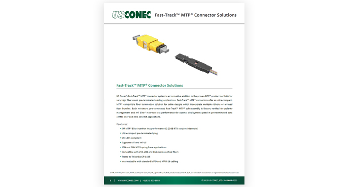 US Conec's Fast-Track™ MTP® connector system is an innovative addition to the proven MTP® product portfolio for high fiber count, pre-engineered cabling applications. Fast-Track™ MTP® connectors offer an ultra-compact, MTP® compatible fiber termination solution to enable pre-terminated assemblies for rapid field installation in congested pathways or conduit previously intended for splicing of bulk cable. Each miniature Fast-Track™ MTP® connector is factory verified for polarity management and MT Elite® insertion loss performance for optimal deployment speed in pre-terminated data center inter and intra connect applications.